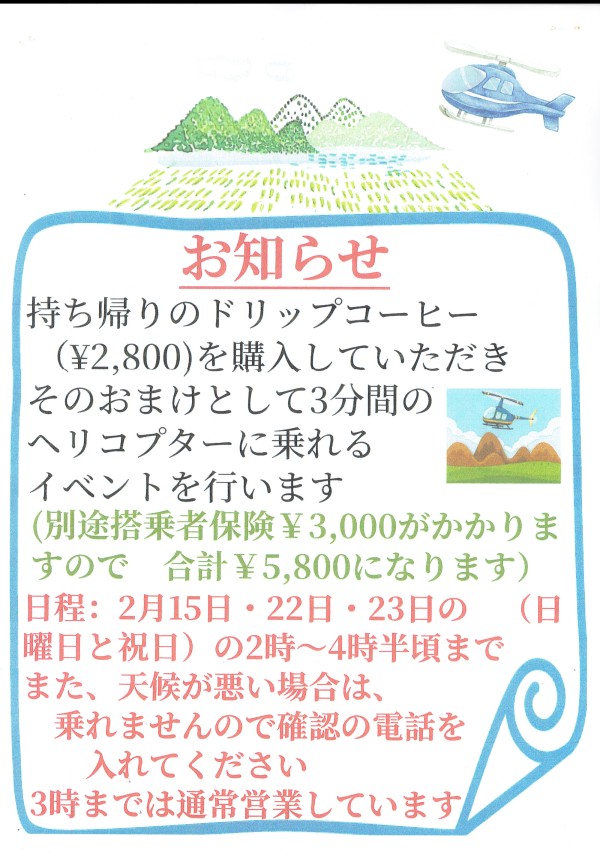 大原野小学校のお向かい、横喫茶か寿がの店主がヘリコプターのイベントをするということ。よろしければどうぞ。およそ、3分、大原野上空を飛ぶということです。